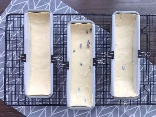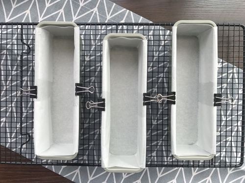 烤箱预热170度,三能家的磅蛋糕模具垫纸。我平时因为手潮,经常倒面糊的时候沾在纸上,所以搞了两个反尾夹把油纸夹在模具边上,亲测好用!