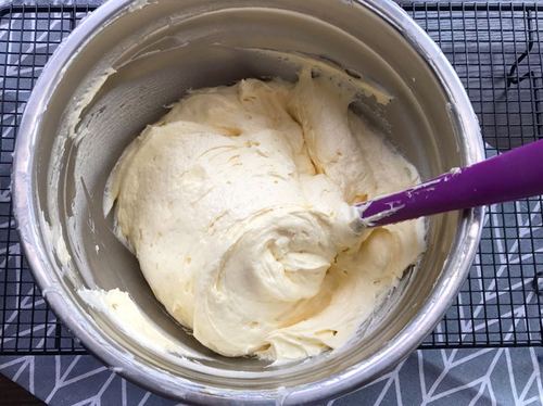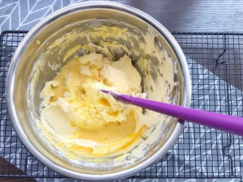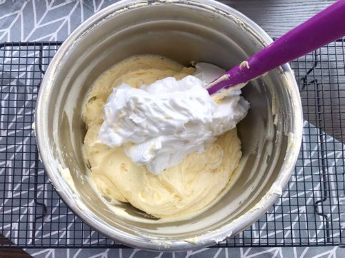 将蛋白霜分次加入面糊中,混合均匀,成品面糊应该是蓬松光滑有弹性的。
