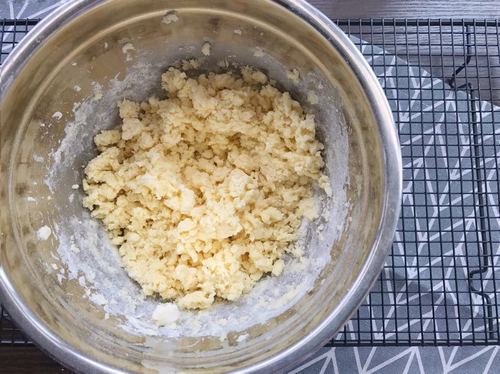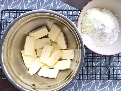 将黄油室温软化后,加入低粉、奶粉、泡打粉,先慢速混合到没有干粉,再改中高速打到体积蓬松,颜色变浅。