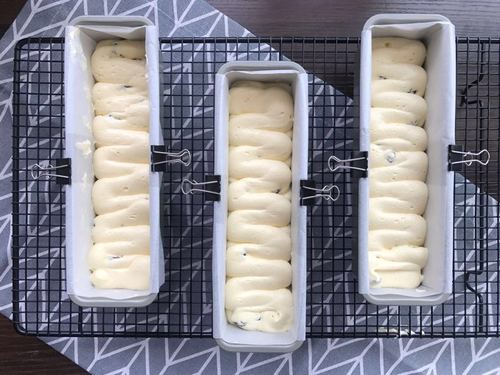 用裱花袋挤入垫好油纸的模具,表面抹成有弧度的样子。170度烤38分钟左右,至表面颜色金黄、膨胀至最高后略略回落即可出炉。