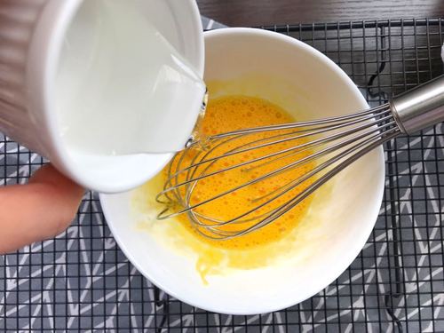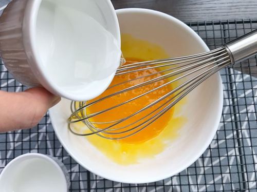 步骤2的蛋奶液加入步骤4中打发的粉油,搅拌至混合均匀即停。