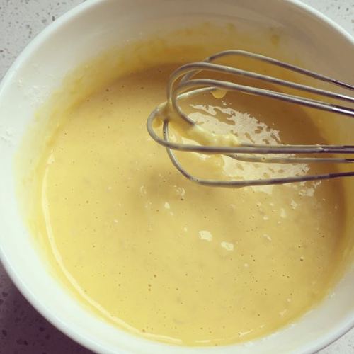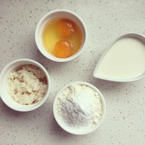 鸡蛋打散,加入酒酿米、水或者牛奶搅匀,再加入粉类搅成糊状