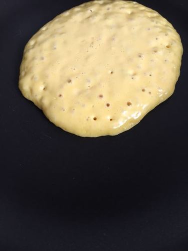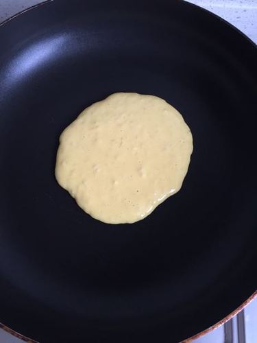 平底锅预热,我用的是苏泊尔红点,一般只要热到隐隐约约看到锅底字母就可以,调整到小火,用电饭锅配的小勺,均匀倒在国内!