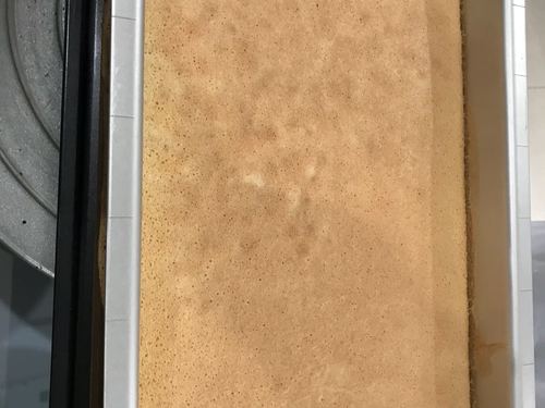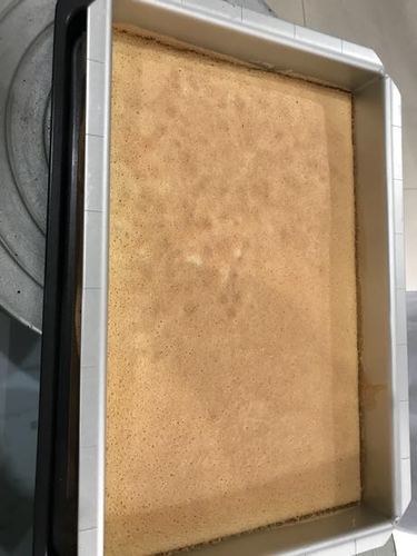 先取1/3蛋白霜到蛋液中拌切均匀,再把剩余的蛋白霜倒入盆中拌匀,再加入低粉33克拌匀,最后加入黄油27克(化开40度)拌匀