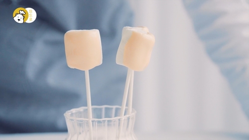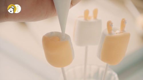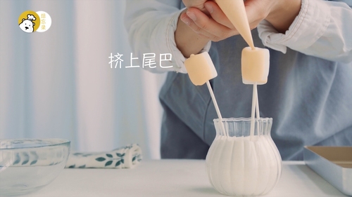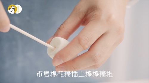 取出市售圆柱形棉花糖,插上纸棍;滚半圈糖霜,固定住晾干1小时;