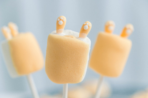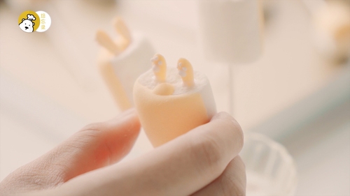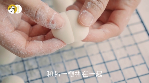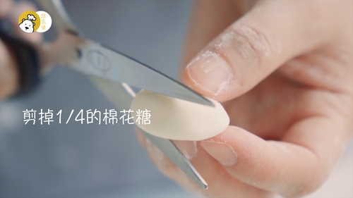 将棉花糖按照大小形状两两配对,配好对的棉花糖用剪刀竖着剪去1/4,剪开的位置拼合在一起,确保完全粘住,基础的柯基屁股就做好了;