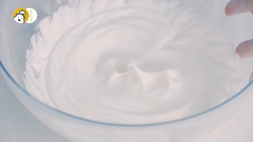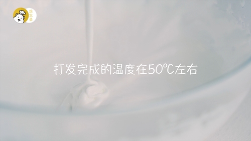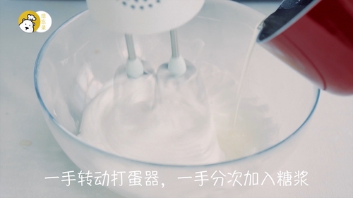 倒完后继续高速打发蛋白,直至温度降低到50℃左右(手摸盆边不特别烫手,在室温约20℃的情况下倒糖浆后大约打1分钟);