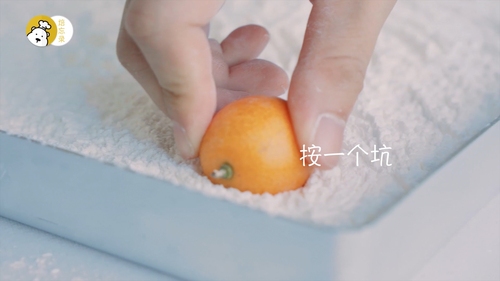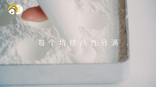将3/4的玉米淀粉倒入平烤盘,用打蛋器拍至松散,用金桔躺着压出25个坑;手边没有金桔也可以,找1个鹌鹑蛋大小的模具就可以;