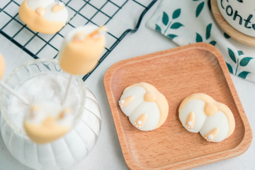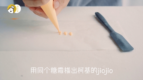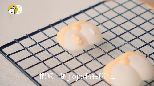 画好后在油纸上继续用调色糖霜描出柯基的jiojio,就普普通通地画个瓜子仁出来就可以了,可以画多几个,以防加肉垫的时候没画好;脚掌晾干1小时后,再给jiojio上加肉垫:用前面一直没用的白色糖霜,剪个超小的口,逐个点上小肉垫,再点中间那团大肉垫;