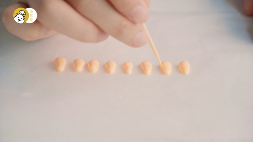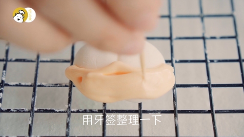 金拱门晾干至表面变硬后,就可以加尾巴了:直接在股沟跟糖霜的交接处挤个球,用牙签调整成圆润的三角形;