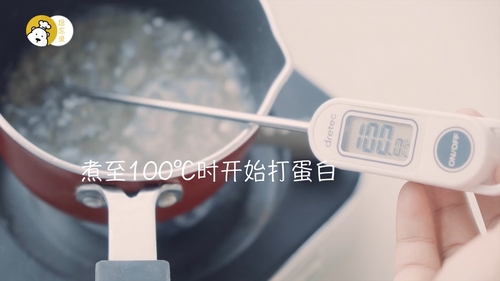 将水、细砂糖A、水饴倒入奶锅中,开始煮糖浆,煮至100℃的时候后,开始打发蛋白:先将蛋白打出细沫,再一次性加入所有细砂糖B,打至湿性发泡;