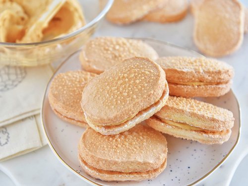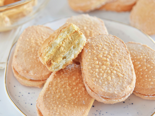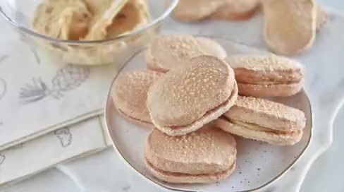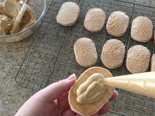在一片达克瓦兹饼上挤一点焦糖奶油霜,盖上另一片,就可以开吃了!