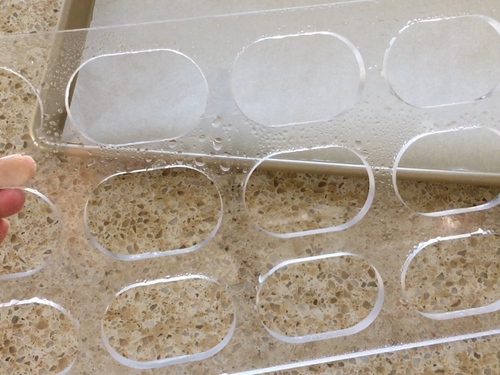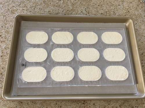 烤盘里铺硅油纸或油布。达克瓦兹模的孔洞内壁喷水,或者冲水沾湿,用纸把模具两面的水分擦干,放在烤盘里;面糊装进裱花袋,挤在模具的坑洞里,稍稍高出模具表面,填好之后用小号曲柄抹刀刮平,最后水平地把模具缓慢抬起脱模;