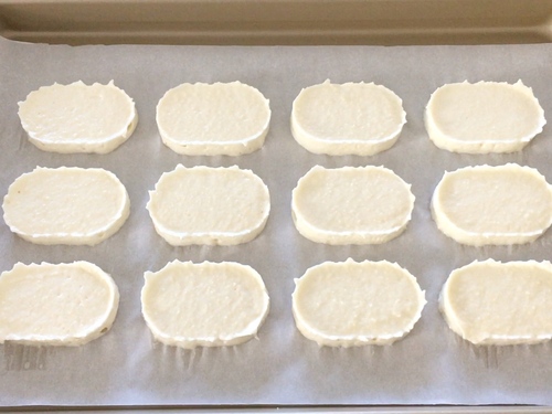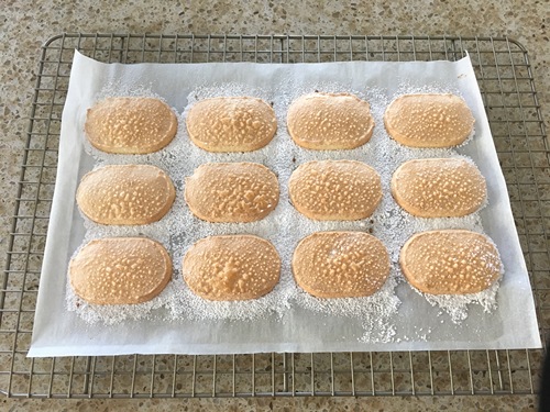 在面糊表面筛糖粉,先薄薄筛一层,等到润湿之后再同样筛一层。等到糖粉基本都被打湿之后入炉,170℃中层烘烤约15-17分钟;出炉后放在烤网上晾凉;