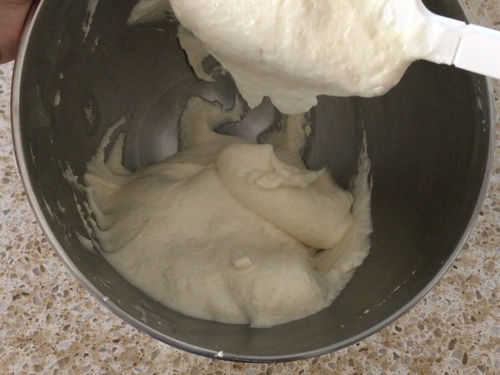 过筛的粉类一次性倒进蛋白霜里搅拌,干粉和蛋白霜混合均匀之后,还要持续翻拌一下,直到面糊出现光泽,用刮刀挑起会大坨大坨地掉下,刮刀面上垂下的面糊呈三⻆角形。大致类似 泡芙面糊的稠度;