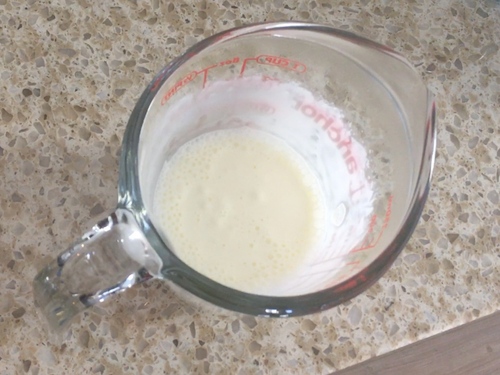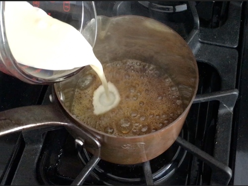 晾凉过程中,可以只做焦糖奶油霜: 淡奶油煮滚,放手边备用;