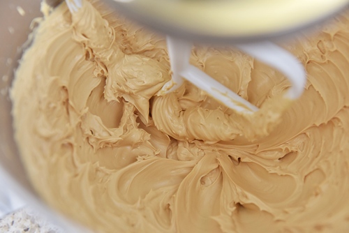 软化之后的黄油充分打发,焦糖浆分三次加入黄油里,也要充分打发,体积膨胀,颜色变浅, 焦糖奶油霜就完成了;