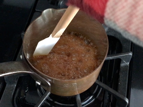 细砂糖倒进小奶锅里,加水,用中小火加热。糖水沸腾之后,气泡会逐渐变大,糖液变得粘稠。其间可以轻轻晃动锅子,让糖浆受热均匀,但不要搅拌它;