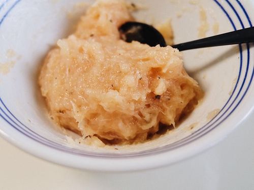 鸡胸肉切小块放入料理机打成鸡蓉,打好的鸡蓉放入碗里加入适量盐,黑胡椒,橄榄油朝一个方向搅打,搅拌均匀