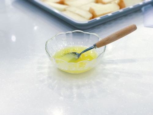 融化的黄油加入蜂蜜搅拌均匀,均匀刷在面包条表面以及侧面