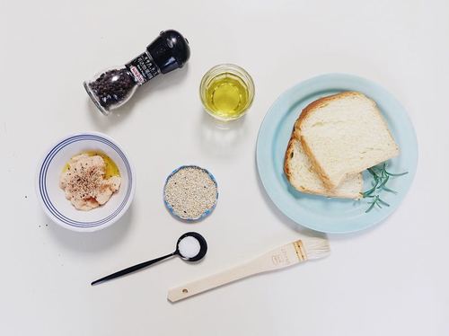 融化的黄油和蒜蓉再加点糖和盐搅拌均匀,用勺子沾点调好的酱汁尝下味道,感觉合适就可以刷在面包表面,再撒点黑胡椒碎和迷迭香在表面