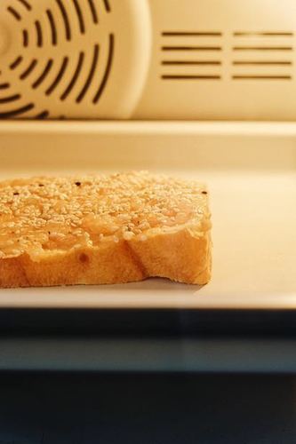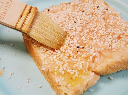 吐司切厚片,将鸡蓉均匀的抹在吐司表面,撒上芝麻,再刷一层橄榄油