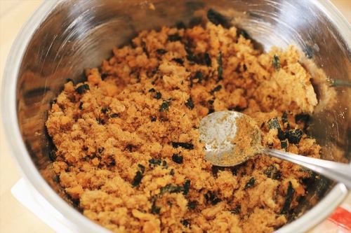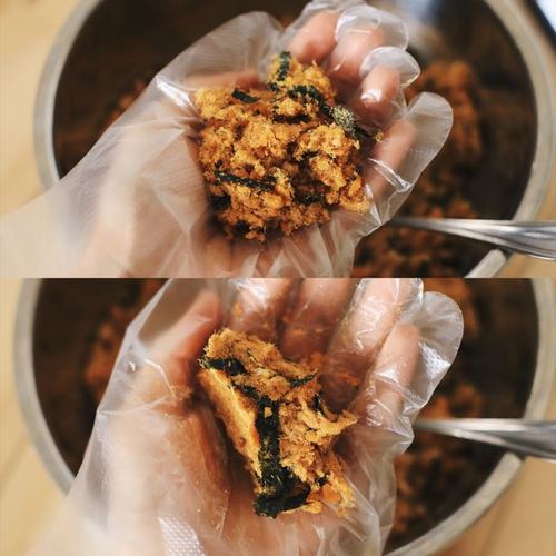 加入80g海苔肉松、6g朗姆酒,与咸蛋黄搅拌均匀。搅拌好后的肉松由于吸收了咸蛋黄中的水和油分会颜色微微变深。