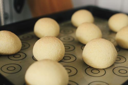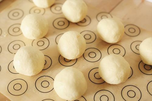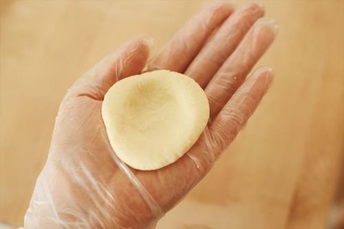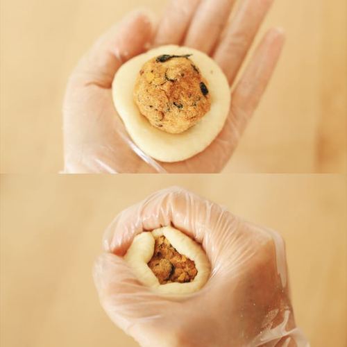 带手套操作。取一个面剂子在手心稍稍按扁中间形成一个窝。