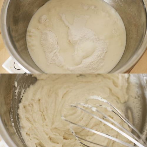 下面来做麻薯面包的皮。在料理盆中放入糯米粉、木薯粉、泡打粉、牛奶,用蛋抽搅拌均匀。