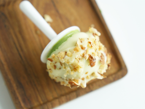 冻好的雪糕取出,迅速插入巧克力酱里,裹一圈后立刻取出,粘一圈杏仁碎,再放入冰箱冷冻(提前在冰箱里放入一个平盘),20分钟后即可取出食用;