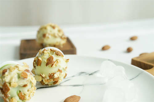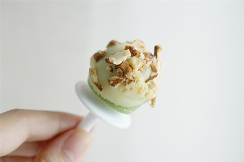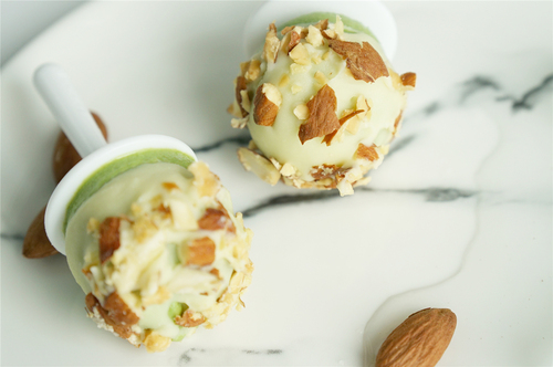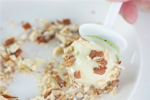4、裹巧克力和杏仁碎的动作衔接要快,如果在巧克力酱里裹太久,雪糕表面可能会融化。而取出后,冷冻的雪糕又会让巧克力很快的凝固,沾不上坚果碎。整个操作环境最好保持在室温25度左右噢!