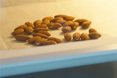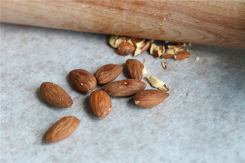 杏仁170度烤8-10分钟,用擀面杖擀碎,放在平盘待用;