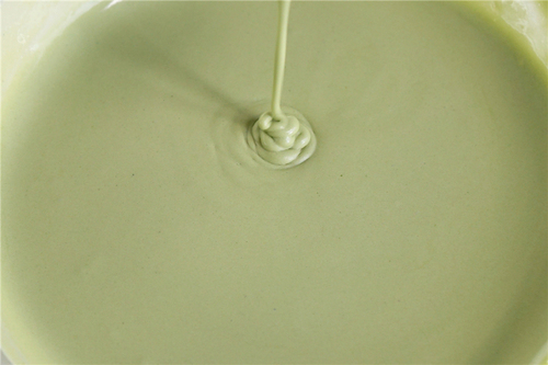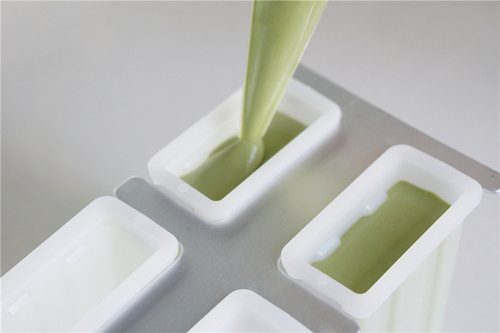 把抹茶奶油加入步骤1中,用蛋抽搅拌均匀;再借助裱花袋装入模具,放冷冻室冷冻5小时以上;