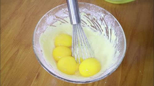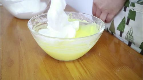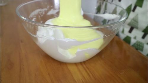 混合均匀的面糊中加入蛋黄,搅拌均匀后是非常细腻的蛋黄糊