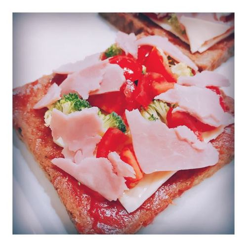 先放一片马苏里里拉奶酪在涂好番茄酱的吐司上,将小番茄,西兰花切小块,并堆放在吐司上待用。(西兰花可以先过水略煮一下)