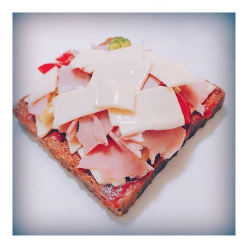 配方:吐司,芝士片,披萨草,蔬菜粒