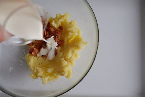 在土豆泥中加入培根碎和淡奶油