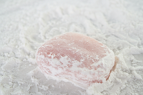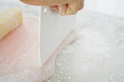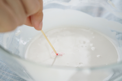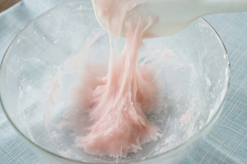 用牙签沾一点点粉红色素,加入步骤1中做好的面团,调成浅浅的粉色(叮熟后颜色会加深,所以别放太多色素);