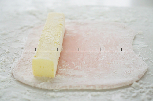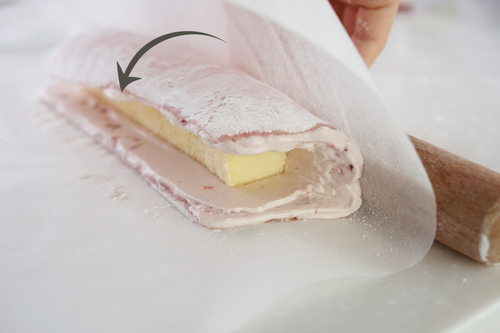 把面皮横着铺在油纸上,用毛刷扫去表面多余淀粉(尽量扫干净);均匀抹一层奶油,边角也要抹到; 把准备好的蛋糕条放在面皮靠近身体的那端,大概跟面皮边缘有半个到一个蛋糕的距离;然后把另一端提起搭在蛋糕上,可以用擀面杖辅助,最后再往收口处翻一下,收好口;