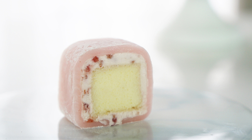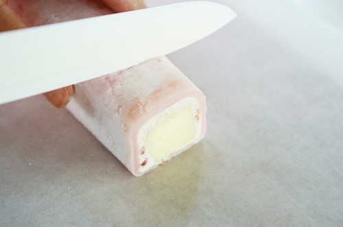 5.糯米皮冷藏后会变硬,所以这款白玉卷在冷冻切开后,室温放置一会就可以吃了,太久了奶油会化掉。因为每一条白玉卷只有五六小块的蛋糕,所以每次取一条出来吃也不会负担很重;