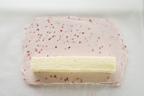 放进冰箱冷冻3小时,就可以取出来了。去掉油纸,稍回温后立刻切开,放至蛋糕柔软就可以吃啦~
