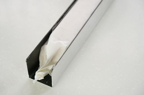 用油纸把蛋糕包好,两头拧住,把蛋糕收口朝下的放进饼干模里,顶部稍微压平整一些;