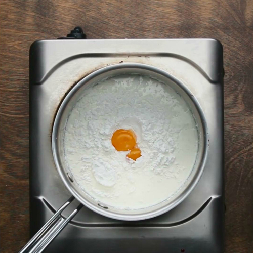 准备一个锅,小火加热,加入蛋黄,奶油,糖和玉米淀粉。调至中高火,持续搅拌防止结块,直到搅拌至粘稠顺滑状;