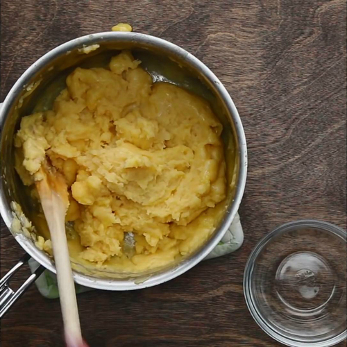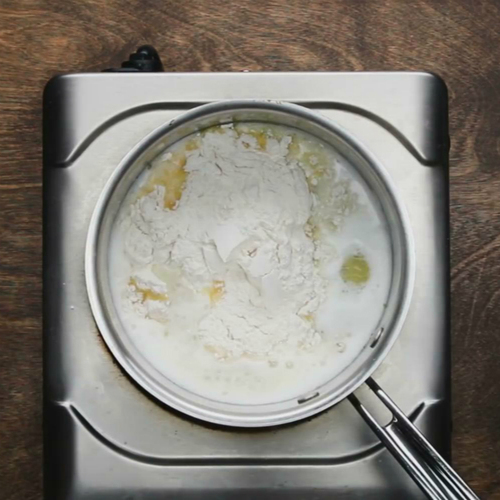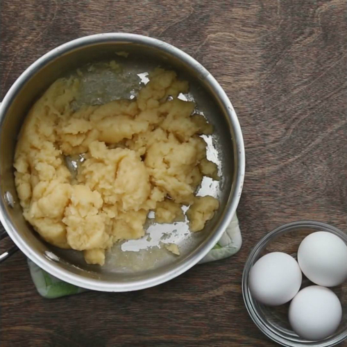 准备一个锅,加入水,盐和黄油,煮至沸腾。加入面粉,搅拌至形成面团。关火;