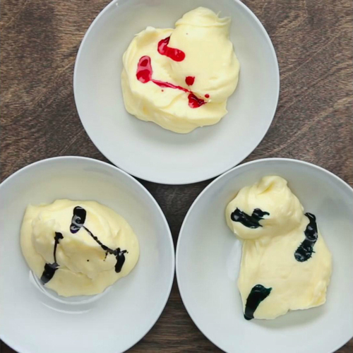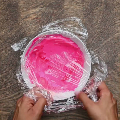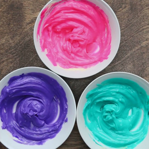 把卡仕达酱均匀倒入3个小碗中,往1个碗里加入3滴食用色素(分别是粉色,蓝绿色,紫色),搅拌均匀。用保鲜膜密封好,切记要用保鲜膜紧紧盖住卡仕达酱,放进冰箱冷藏;