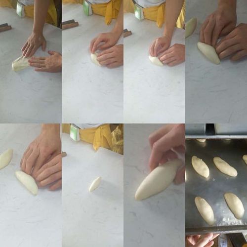 稍微拉长,翻面,向下拍排气;用食指中指无名指从外往里面收,卷成橄榄形。 放入烤盘发酵两个小时