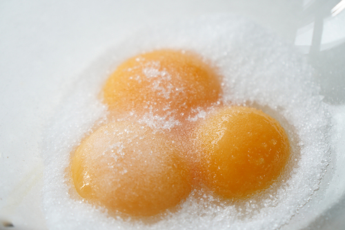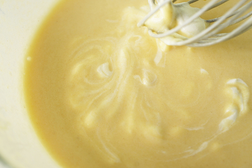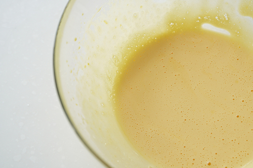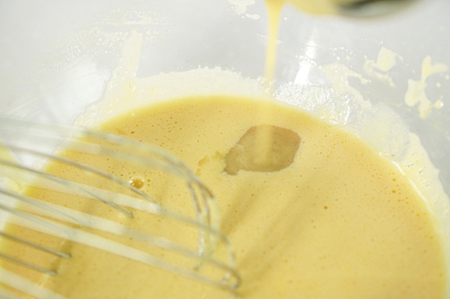 将玉米糊缓缓倒入蛋黄中,边倒边搅打,防止蛋黄受热变成絮状,形成玉米蛋黄糊,放入冰箱冷藏1小时;