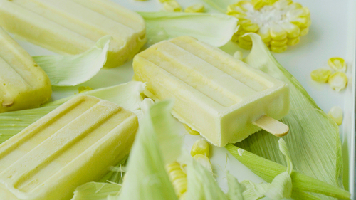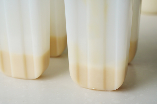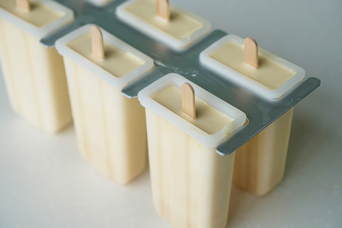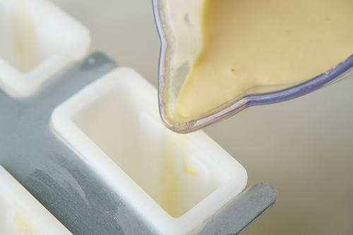再将2/5的淡奶油加入第6步的玉米奶油液中,调成较浅的黄色,倒至模具2/3的位置,插入冰棒棍,放入冷冻半小时;