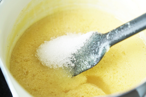 步骤2做好的玉米汁加入细砂糖B,小火加热,不断搅拌,变成粘稠的玉米糊后关火;