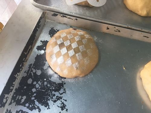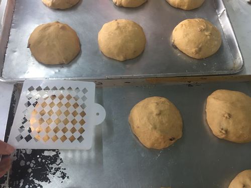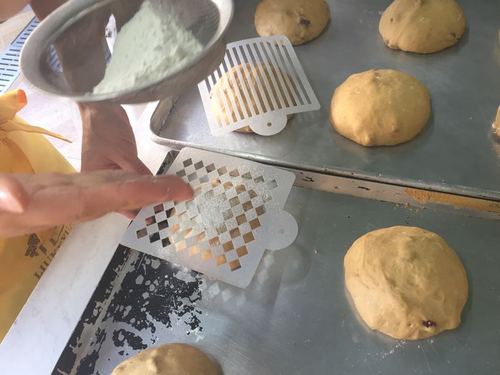 搓圆发酵两个小时,在表面上放印纸撒上高粉,入炉时炉前撒热水